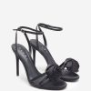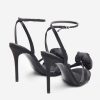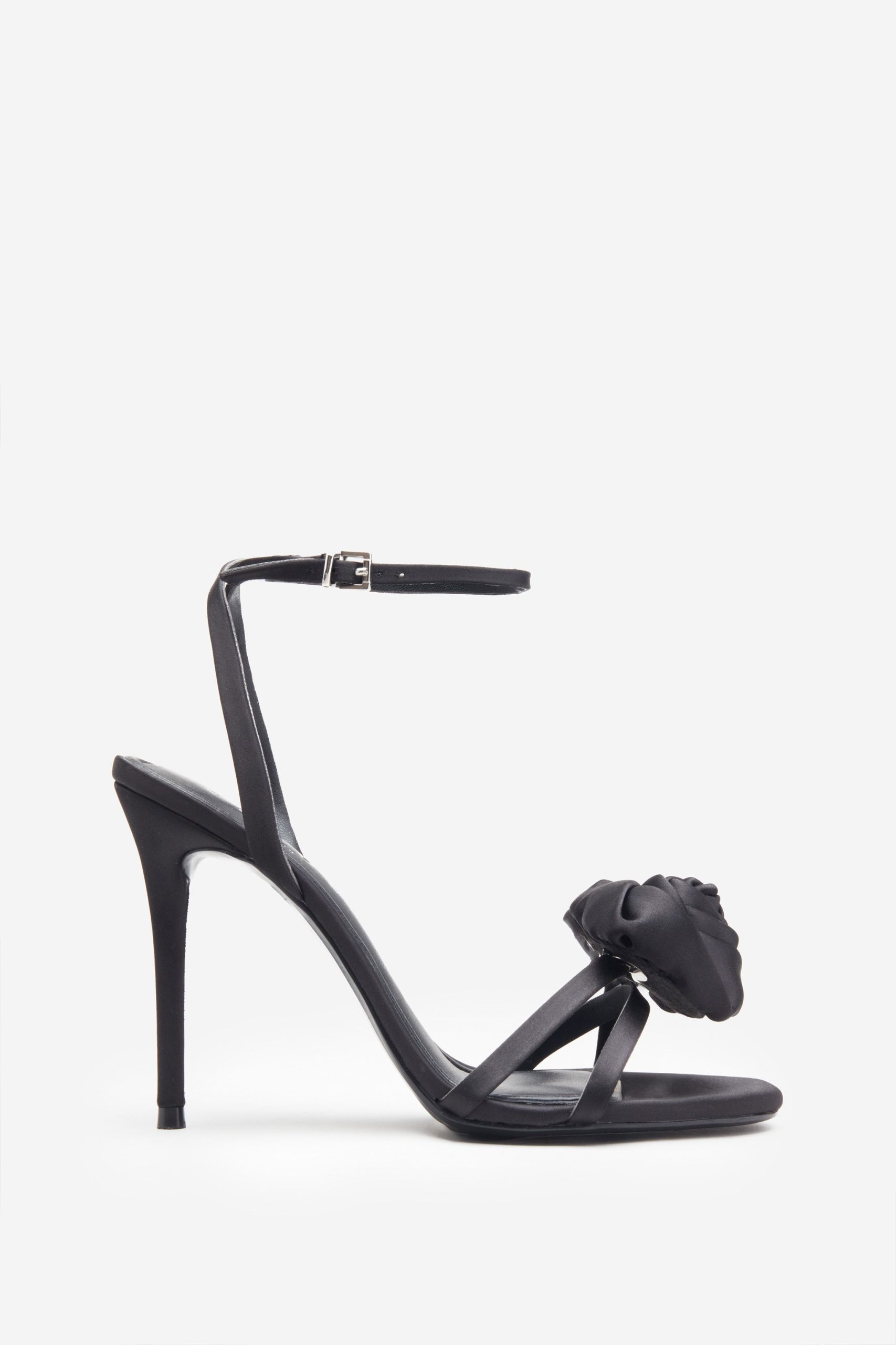 Feminine with a touch of drama, the Black Strappy Heels bring a romantic twist to your evening wardrobe. Crafted from opulent black satin, these lace-up stilettos feature a delicate floral corsage across the toe and a softly rounded silhouette. Finished with a secure ankle strap and cushioned sole, they offer beauty without compromising comfort.