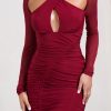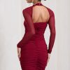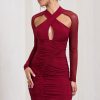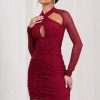 Seraphine London™ presents a refined take on evening allure with this sculpted mini dress. Designed in rich berry stretch jersey and ruched throughout to accentuate the figure, the silhouette is elevated by sheer mesh sleeves and a daring front cut-out. Subtle yet bold, it’s a statement in quiet confidence — made for nights that leave a lasting impression.
