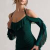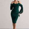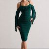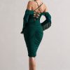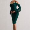 Seraphine London™ captures feminine strength and romantic edge in this sculpting midi silhouette. Crafted from premium stretch jersey in a deep bottle green, the design is fully ruched to contour the figure and features a sweetheart neckline paired with sheer ruffled sleeves. A lace-up open back and cold-shoulder detail add structure and sensuality — perfect for evenings that call for a bold impression.