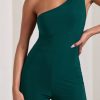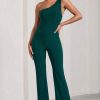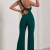 Seraphine London™ redefines sleek sophistication with this fluid, flared-leg jumpsuit in a rich bottle green hue. Designed in premium stretch jersey, this sleeveless silhouette features an asymmetric neckline and a striking open back with twisted loop detailing. A modern wardrobe essential with a refined finish, this style is perfect for romantic evenings, cocktail parties, or gallery events alike.