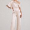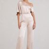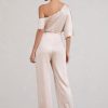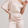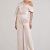 Seraphine London™ introduces a refined statement piece designed to stand out from day to night. Crafted in premium heavy satin, this champagne-hued jumpsuit features a fluid asymmetric neckline with softly draped short sleeves. Subtle shaping darts define the waist, while flared legs add movement and grace. Whether styled for a sophisticated brunch or a black-tie affair, this tailored silhouette delivers effortless elegance.