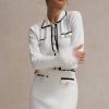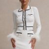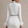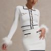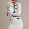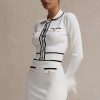 Seraphine London™ introduces a refined knitwear piece designed for women who dress with intention. Crafted from a premium fine knit in soft cream, this cropped cardigan features opulent pearl buttons, contrast piping, and dramatic feather-trimmed cuffs. The tailored fit and luxe details create a statement silhouette — effortlessly pairing with matching skirts or tailored separates.