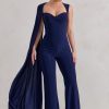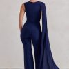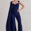 Seraphine London™ blends refined structure with graceful movement in this striking navy jumpsuit. Designed in premium stretch jersey, this tailored silhouette features a sweetheart neckline, shoulder straps, and a fluid asymmetric cape sleeve that cascades over the arm. Wide legs add elegant flow, making this the perfect style for weddings, soirées, and any special occasion that calls for understated glamour.