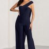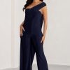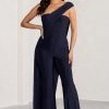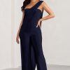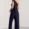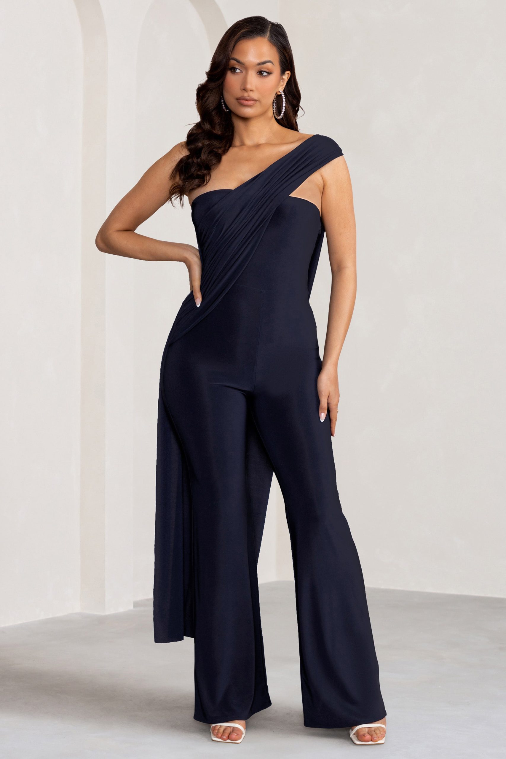 Seraphine London™ captures modern elegance with this draped navy jumpsuit, designed to make an impact at any upscale occasion. Crafted from ultra-stretch premium jersey, this figure-flattering silhouette features an asymmetric one-shoulder neckline, a dramatic cape detail, and elongating wide legs. Polished yet effortless, this statement piece is ideal for weddings, galas, and black-tie affairs alike.