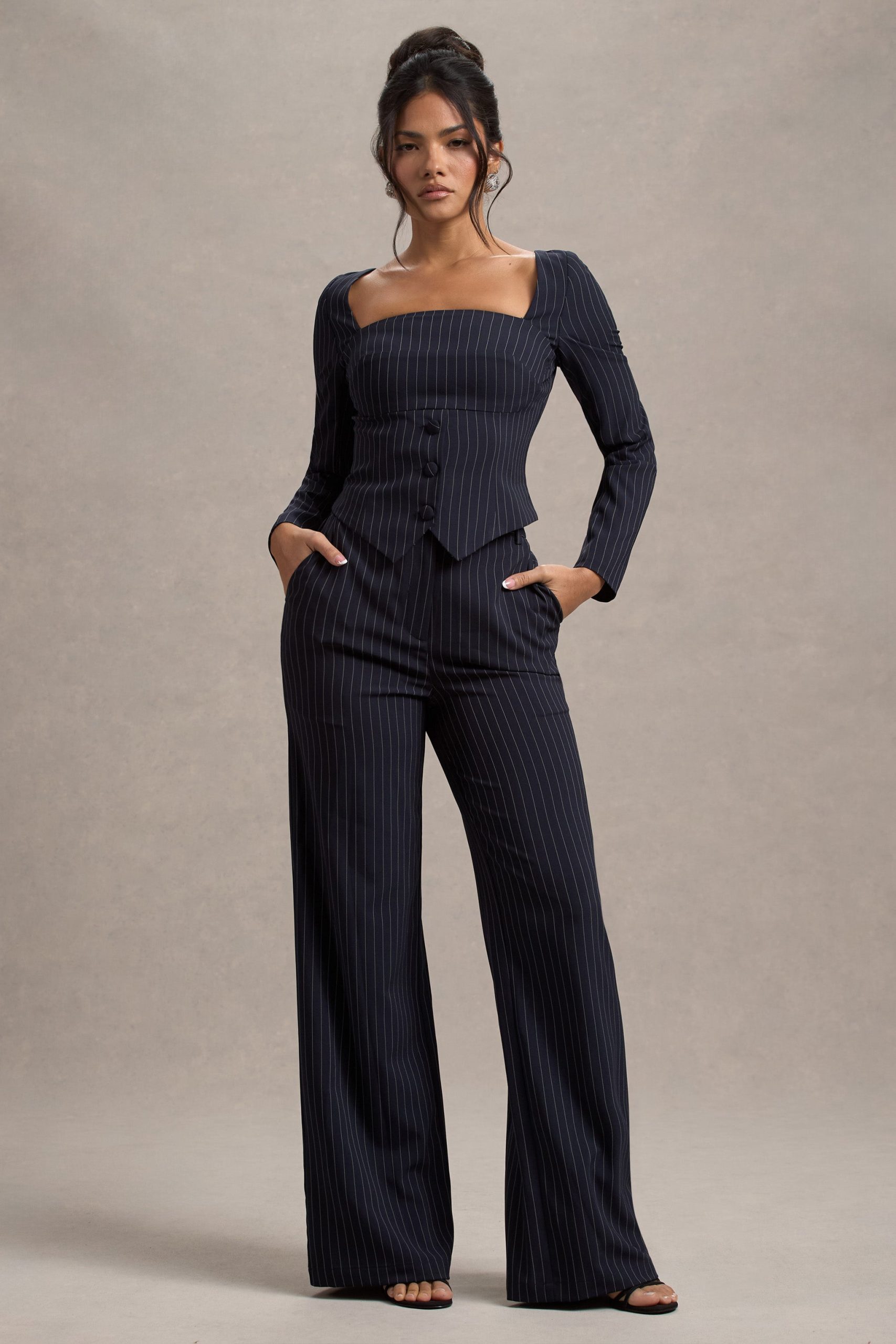 Seraphine London™ redefines modern tailoring with this elevated wardrobe essential. Crafted from premium woven fabric in a classic navy pinstripe, this high-waisted silhouette features a wide leg for effortless movement and an elasticated waistband for all-day comfort. Polished yet relaxed, these trousers pair seamlessly with structured tops or matching coordinates for a chic, preppy finish.