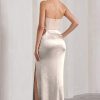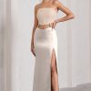 Seraphine London™ introduces a bold yet refined silhouette designed to leave a lasting impression. This sculptural maxi dress features a structured boned corset bodice with a bandeau neckline, while a cut-out waist and suspender clip detailing add modern allure. Crafted in smooth stretch crepe and satin, the design is completed with a flowing skirt and high-leg split — blending elegance with edge.