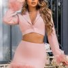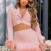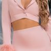 Seraphine London™ introduces a softly structured silhouette designed to make a lasting impression. This cropped blazer in blush is tailored in stretch crepe to accentuate the waist, finished with a plunging V-neckline for subtle sophistication. Feather-trimmed cuffs bring soft texture and festive flair — the perfect combination of polish and playfulness for elegant occasions.
