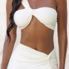 Seraphine London™ delivers a fresh take on minimalism with this refined white bralette. Designed in premium stretch jersey, the silhouette features a single shoulder strap and a sculptural twist at the bustline. With its clean lines and secure rear zip fastening, this piece brings understated elegance to resort evenings or elevated city styling.
