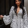 Seraphine London™ captures the spirit of European summers with this playful yet polished white polka dot playsuit. Crafted from a premium lightweight woven fabric, this breezy silhouette features voluminous balloon sleeves with elasticated cuffs, a plunging V-neckline, and a buttoned waist panel that accentuates the figure. Flared shorts add a flirtatious finish, making this the perfect companion for sun-soaked days and coastal strolls.