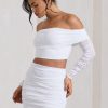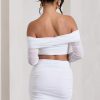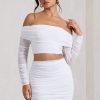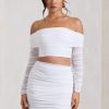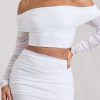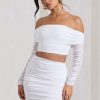 Seraphine London™ captures modern romance in this ruched Bardot crop top. Crafted from premium stretch jersey with a soft mesh overlay, the silhouette features an off-the-shoulder neckline, sculpting all-over ruching, and sheer long sleeves. Delicate yet daring, this top pairs perfectly with coordinating skirts or tailored trousers for statement occasions.
