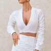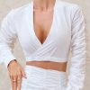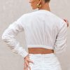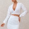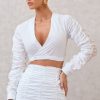 Seraphine London™ presents a fresh take on shirting with this crisp cropped wrap silhouette. Designed in structured white poplin, this long-sleeve top features ruched detailing, a plunging V-neckline, and a flattering wrap front. The sculpted fit is perfect for transitional styling — whether paired with its coordinating skirt or elevated with tailored separates.